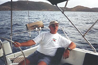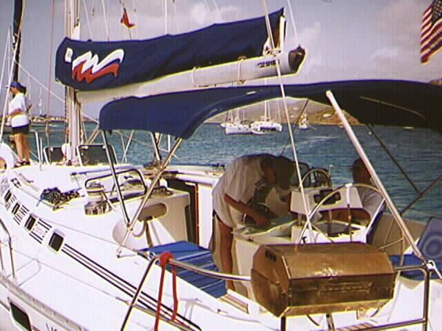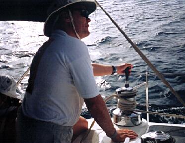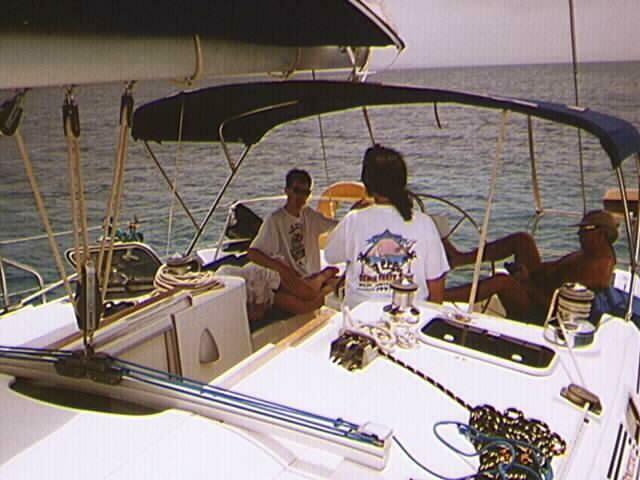 Lee adjusts the sails for a reach to West End. While