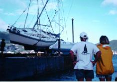 as well as us, looking at a beautiful boat with a hole in her hull being lifted by the